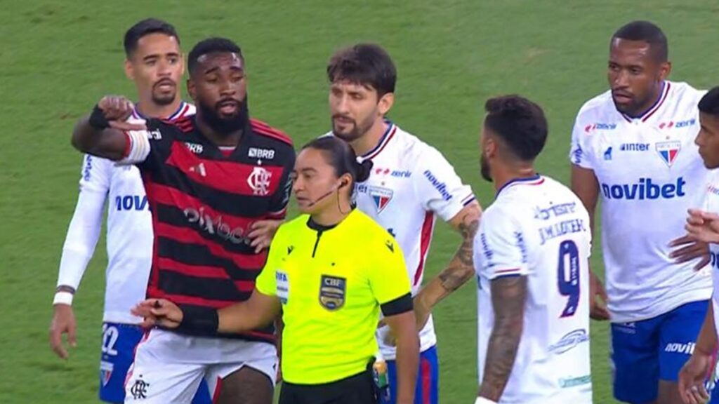A arbitragem virou assunto em mais um jogo do Flamengo no Campeonato Brasileiro. Nesta quinta-feira (11), o Fortaleza abriu o placar logo no início do embate com um lance duvidoso. O tento do time fortalezense foi de Wesley, contra. No entanto, antes de desviar na bola, o lateral direito foi empurrado pelo atacante Lucero. Edina Alves Batista, árbitra do duelo, não consultou o VAR.