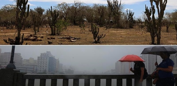 Mapa meteorológico mostra forte seca no sertão do Nordeste (esq.) e aproximação de massa de ar úmida do litoral da região (dir.)