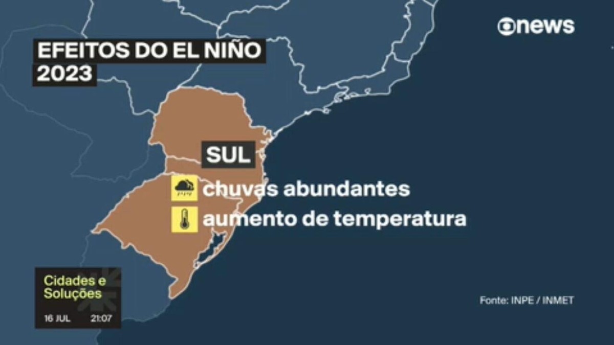 O Instituto Nacional de Meteorologia (Inmet) e o Instituto Nacional de Pesquisas Espaciais (Inpe) indicam mais de 90% de probabilidade do fenômeno El Niño se manifestar até, pelo menos, o final de 2023.